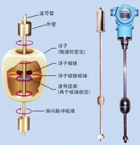 傳感器工作時(shí),電路部分將在波導(dǎo)絲上激勵(lì)出脈沖電流,該電流沿波導(dǎo)絲傳播時(shí)會(huì)在波導(dǎo)絲的周?chē)a(chǎn)生脈沖電磁場(chǎng)。在傳感器測(cè)桿外配有一浮子,此浮子可沿測(cè)桿隨液位的變化而上下移動(dòng)。在浮子內(nèi)部有一組永久磁環(huán)。當(dāng)脈沖電流磁場(chǎng)與浮子產(chǎn)生的磁環(huán)磁場(chǎng)相遇時(shí),浮子周?chē)拇艌?chǎng)發(fā)生改變從而使得由磁致伸縮材料做成的波導(dǎo)絲在浮子所在的位置產(chǎn)生一個(gè)扭轉(zhuǎn)波脈沖,這個(gè)脈沖以固定的速度沿波導(dǎo)絲傳回并由檢出機(jī)構(gòu)檢出。   通過(guò)測(cè)量脈沖電流與扭轉(zhuǎn)波的時(shí)間差可以精確地確定浮子所在的位置,即液面的位置。