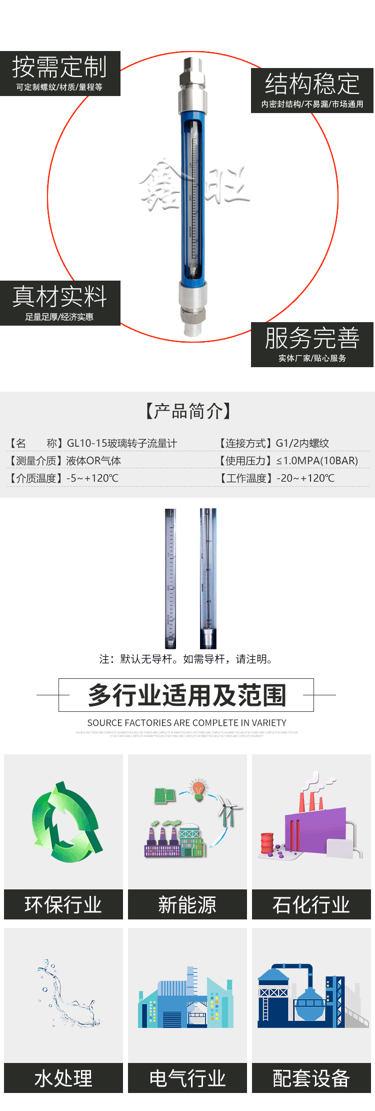 GL/RL/FL10、20、30型玻璃轉(zhuǎn)子流量計(jì)可替代引進(jìn)成 套設(shè)備上的玻轉(zhuǎn)儀表,廣泛應(yīng)用于化工、輕工、制藥、 食品、造紙、環(huán)保和計(jì)量測試、科研等部門,測量單相 非脈動(dòng)流體(液體或氣體)的流量。