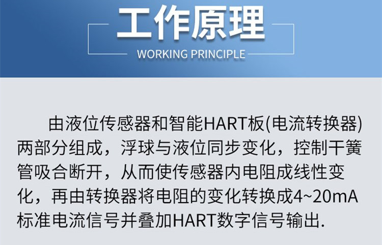 UQK磁性浮球液位計主要由磁浮球、傳感器、變送器三部分組成。浮球液位計采用304不銹鋼、pvc、PTFE等材料作保護管和安裝固定件;對于腐蝕性很強的介質(zhì),采用聚四氟乙烯燒結在接觸介質(zhì)金屬保護管,浮球的表面,以確保液位儀表不被腐蝕。根據(jù)用戶要求預設磁敏元件,浮球隨液面上下運動改變磁敏元件的預設狀態(tài)發(fā)出通斷信號,實現(xiàn)對液面的監(jiān)控。當磁浮球隨液面的變化,沿導管而上下浮動時,浮球內(nèi)的磁鋼吸合傳感器內(nèi)相應位置上的干簧管使傳感器的總電阻值發(fā)生變化,再由變送器將變化后的電阻信號轉(zhuǎn)換成4-20mA的電信號輸出,并通過數(shù)顯控制儀或光柱數(shù)顯儀對液位進行遠距離測量,并可在顯示儀上設定上、下限報警,實現(xiàn)對液位的遠程數(shù)字控制。