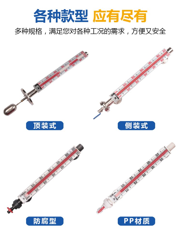 5.磁翻板液位計(jì)最顯著的特點(diǎn)是液體介質(zhì)與指示器完全隔離,所以在任何情況下都非常安全,可靠,耐用,而且各種型號(hào)的磁翻板液位計(jì)配上液位報(bào)警、控制開關(guān),可實(shí)現(xiàn)液位或界位的上、下限越位報(bào)警,控制或連鎖。