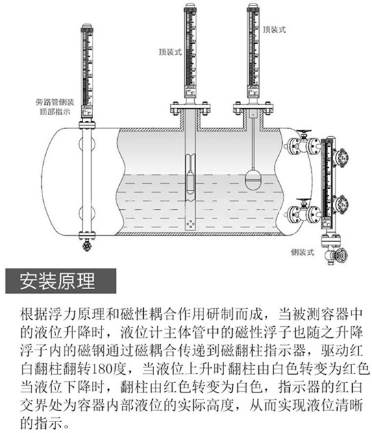 根據(jù)浮力原理,浮子在測量管內(nèi)隨液位的升降而上、下移動(dòng),浮子內(nèi)的永久磁鋼通過耦合作用,驅(qū)動(dòng)紅、白色翻柱翻轉(zhuǎn)180°,液位上升時(shí)翻柱由白色轉(zhuǎn)為紅色,下降時(shí)由紅色轉(zhuǎn)為白色,從而實(shí)現(xiàn)液位指示。